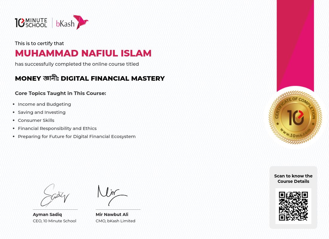 “টেন মিনিট স্কুল থেকে Muhammad Nafiul Islam ২০ নভেম্বর, ২০২৫ তারিখে Money জ্ঞানী: Digital Financial Mastery কোর্সটি সফলভাবে সম্পন্ন করেছেন।”