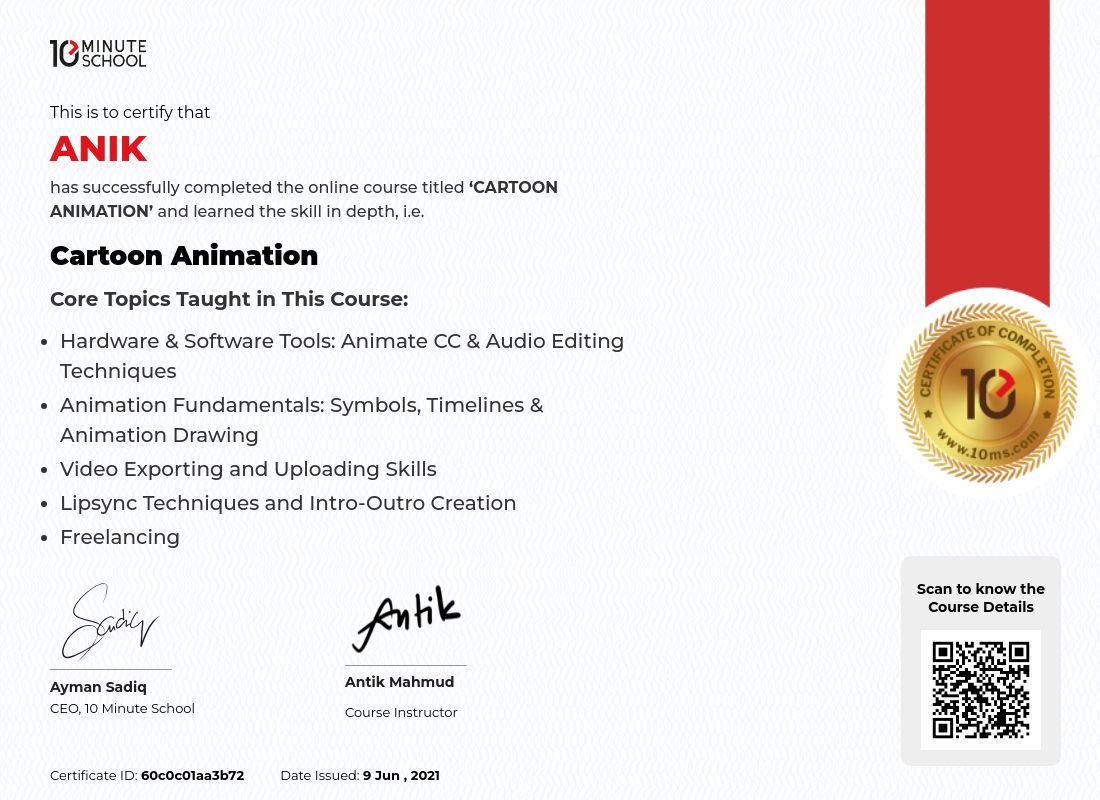 “টেন মিনিট স্কুল থেকে Anik ৯ জুন, ২০২১ তারিখে Cartoon Animation কোর্সটি সফলভাবে সম্পন্ন করেছেন।”