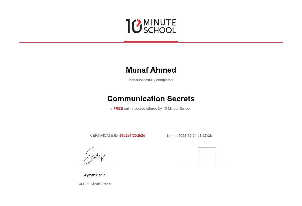 “টেন মিনিট স্কুল থেকে Munaf AHmed ২১ ডিসেম্বর, ২০২২ তারিখে Communication Secrets কোর্সটি সফলভাবে সম্পন্ন করেছেন।”