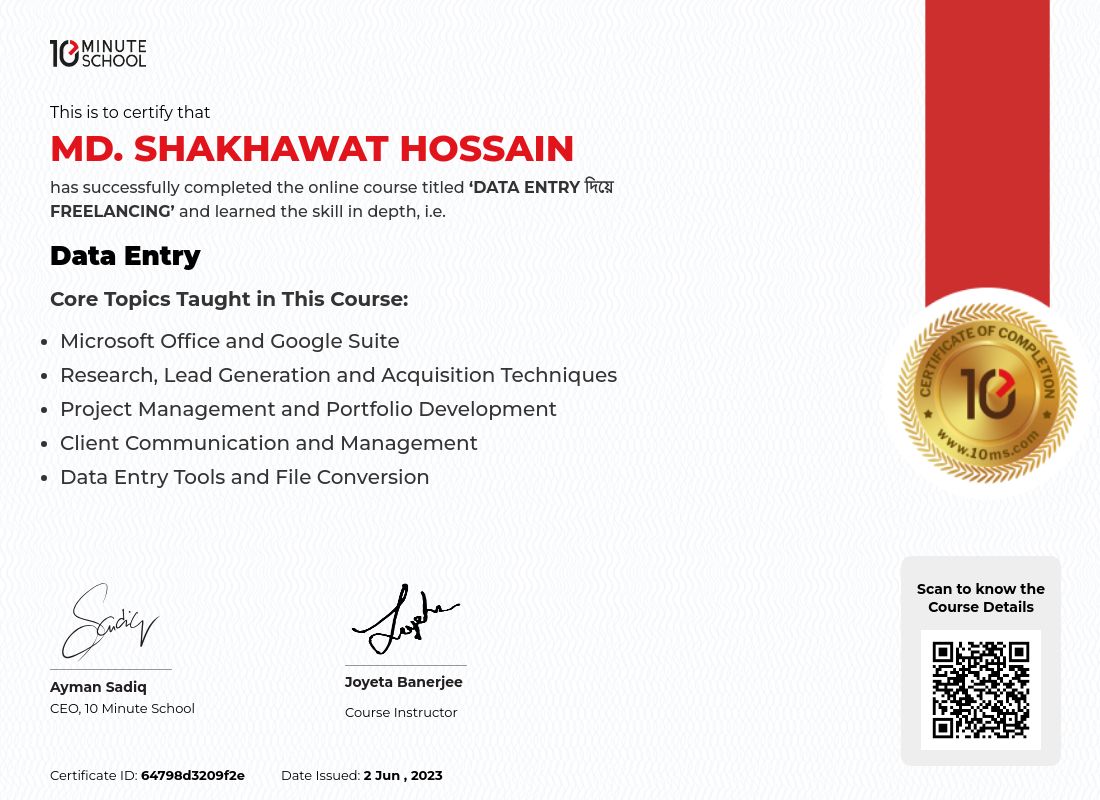 “টেন মিনিট স্কুল থেকে Md. Shakhawat Hossain ২ জুন, ২০২৩ তারিখে Data Entry দিয়ে Freelancing কোর্সটি সফলভাবে সম্পন্ন করেছেন।”