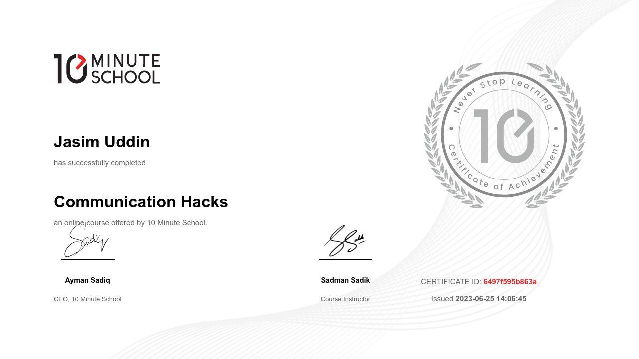 “টেন মিনিট স্কুল থেকে Jasim Uddin ২৫ জুন, ২০২৩ তারিখে Communication Hacks কোর্সটি সফলভাবে সম্পন্ন করেছেন।”