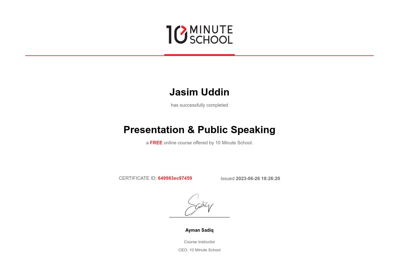 “টেন মিনিট স্কুল থেকে Jasim Uddin ২৬ জুন, ২০২৩ তারিখে Presentation & Public Speaking কোর্সটি সফলভাবে সম্পন্ন করেছেন।”