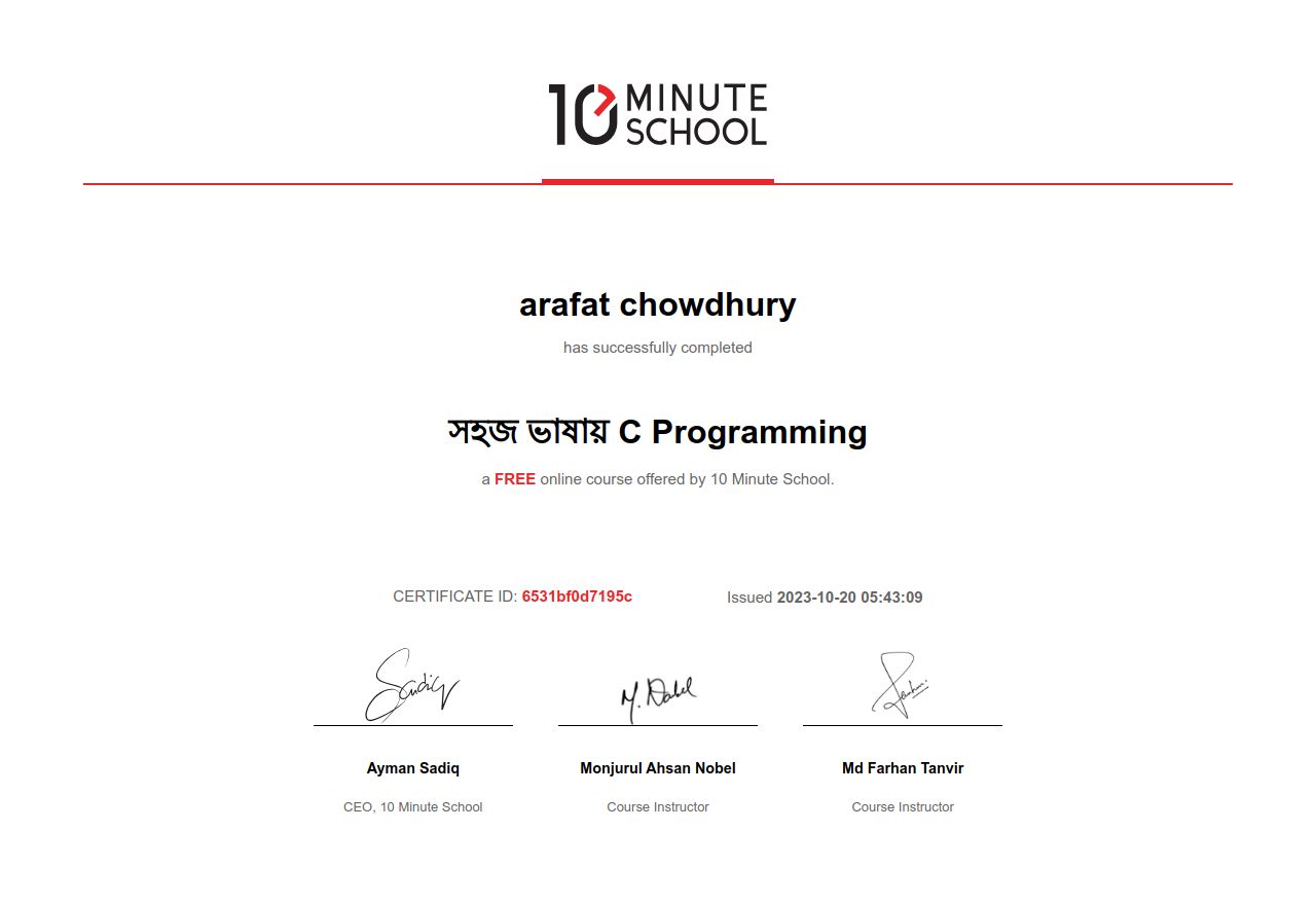 “টেন মিনিট স্কুল থেকে arafat chowdhury ১৯ অক্টোবর, ২০২৩ তারিখে সহজ ভাষায় C Programming কোর্সটি সফলভাবে সম্পন্ন করেছেন।”
