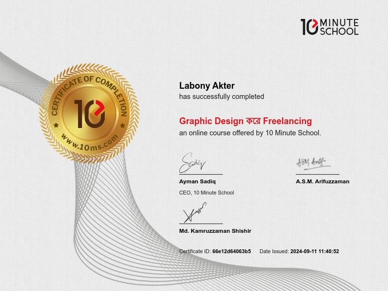 “টেন মিনিট স্কুল থেকে Laboni ১১ সেপ্টেম্বর, ২০২৪ তারিখে Graphic Design করে Freelancing কোর্সটি সফলভাবে সম্পন্ন করেছেন।”