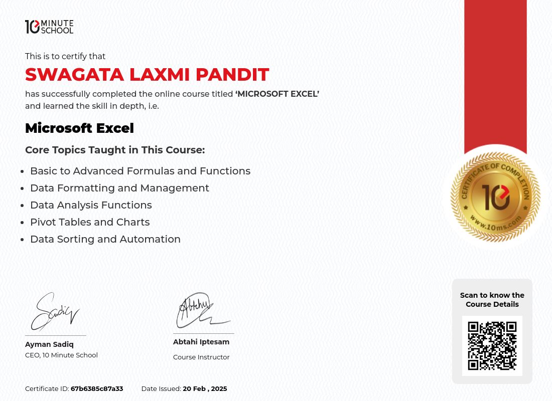 “টেন মিনিট স্কুল থেকে Swagata Laxmi Pandit ১৯ ফেব্রুয়ারী, ২০২৫ তারিখে Microsoft Excel কোর্সটি সফলভাবে সম্পন্ন করেছেন।”