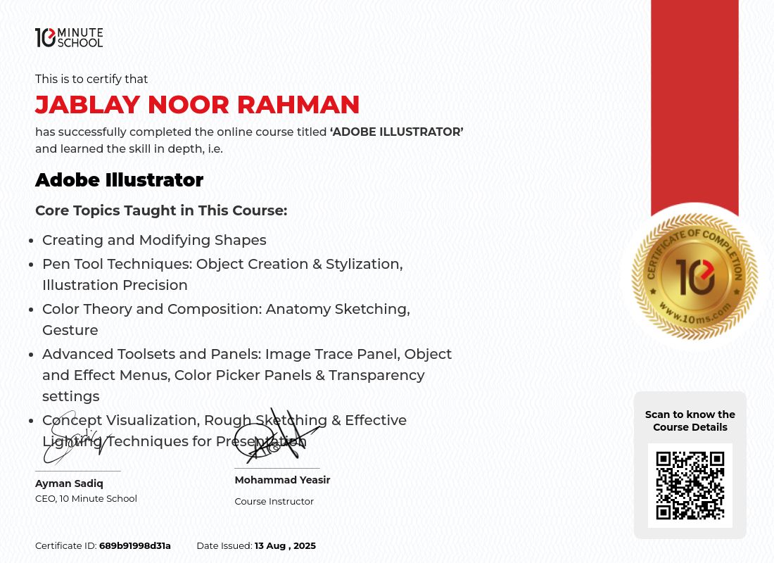“টেন মিনিট স্কুল থেকে Jablay Noor Rahman ১২ আগস্ট, ২০২৫ তারিখে Adobe Illustrator কোর্সটি সফলভাবে সম্পন্ন করেছেন।”