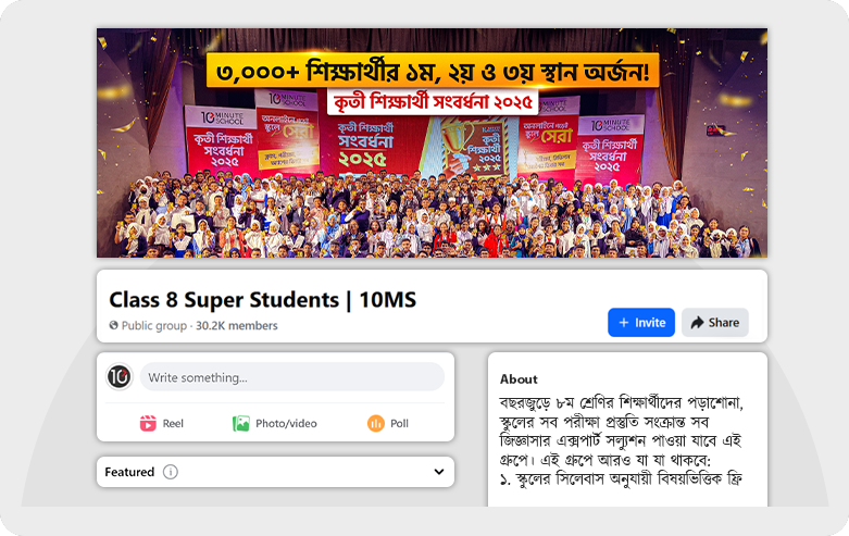 সারাদেশের বিভিন্ন স্কুলের শিক্ষার্থী ও এক্সপার্ট টিচারদের সাথে সবসময় কানেক্টেড থাকতে জয়েন করো আমাদের ফেসবুক গ্রুপে।