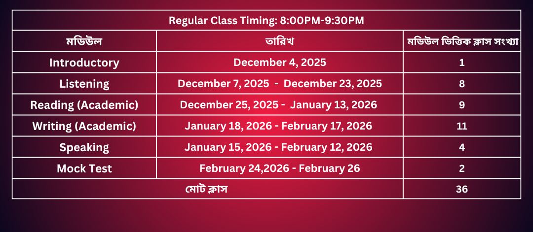 - পরিপূর্ণভাবে IELTS পরীক্ষার স্কোরিং সিস্টেম এবং সকল ধরনের Question-Answer করার Pattern বুঝে IELTS পরীক্ষায় কাঙ্ক্ষিত ব্যান্ড স্কোর অর্জন করতে সক্ষম হবেন।