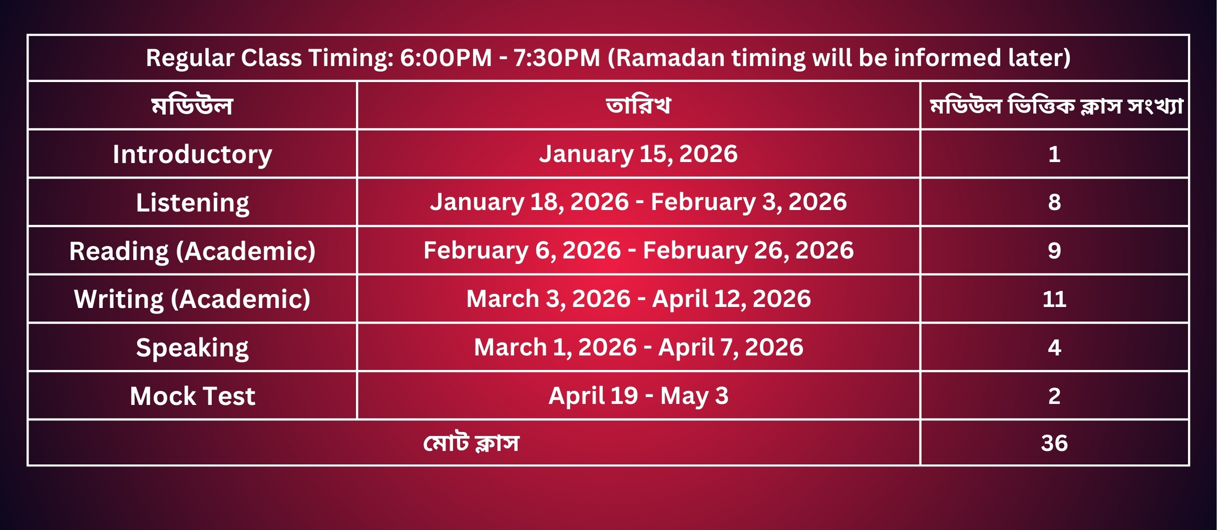 - পরিপূর্ণভাবে IELTS পরীক্ষার স্কোরিং সিস্টেম এবং সকল ধরনের Question-Answer করার Pattern বুঝে IELTS পরীক্ষায় কাঙ্ক্ষিত ব্যান্ড স্কোর অর্জন করতে সক্ষম হবেন।